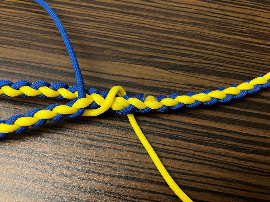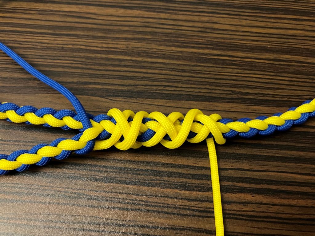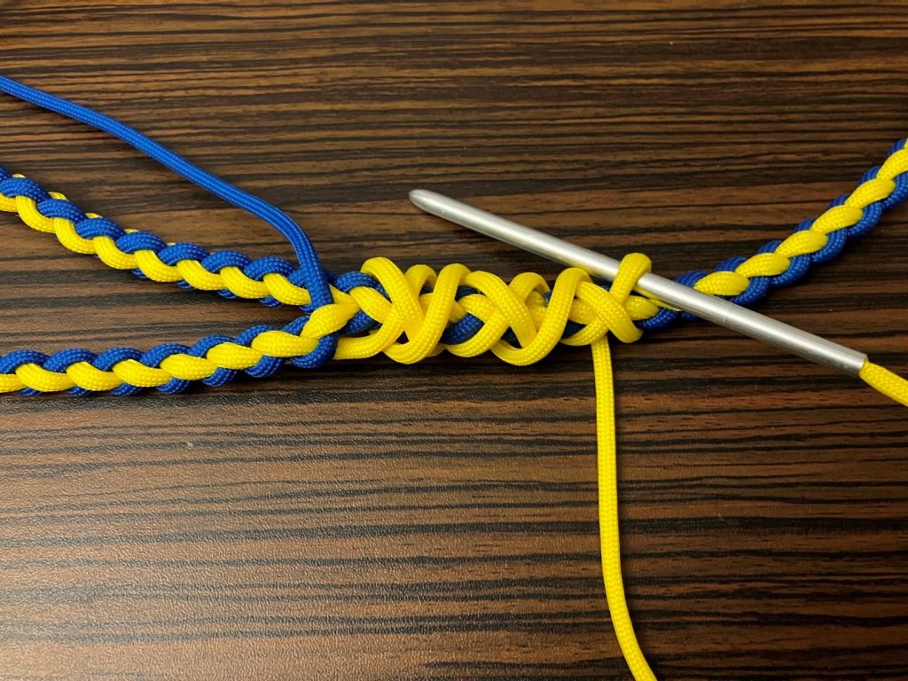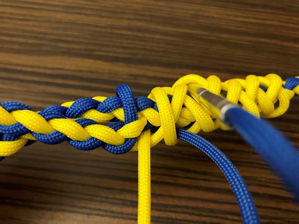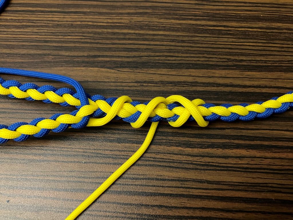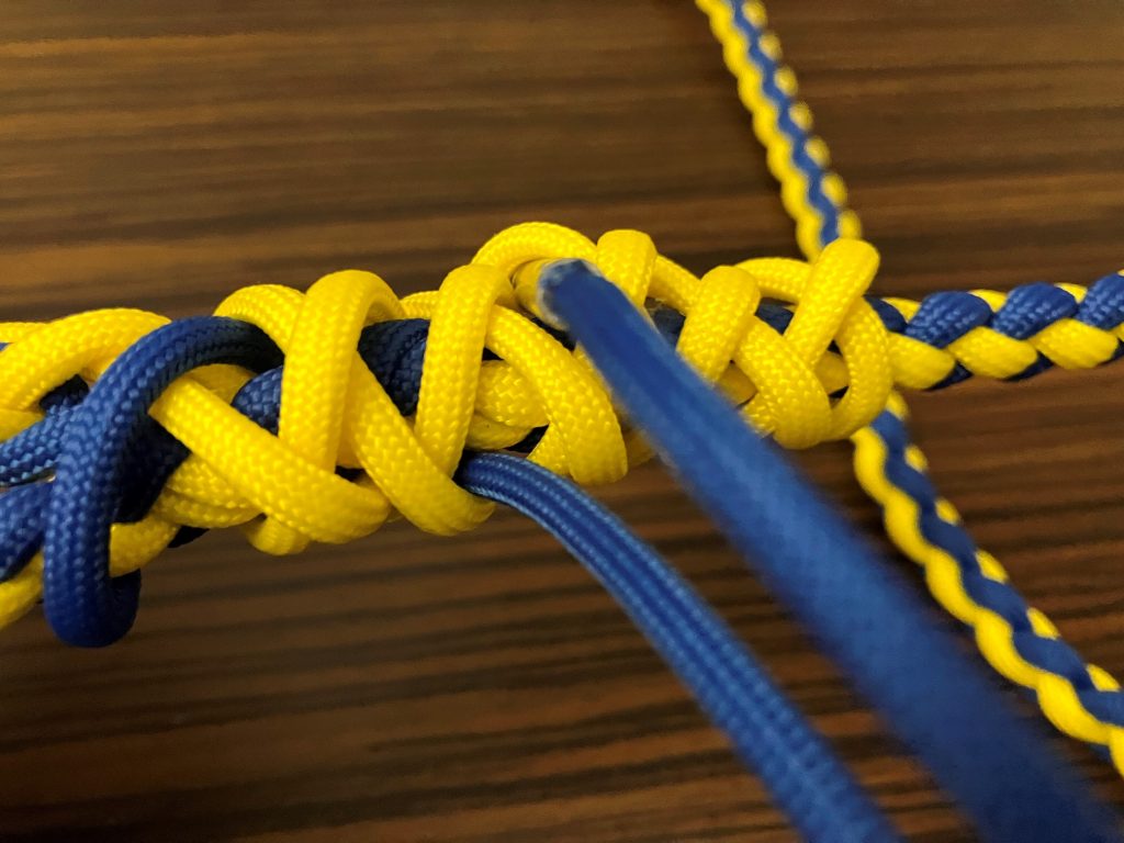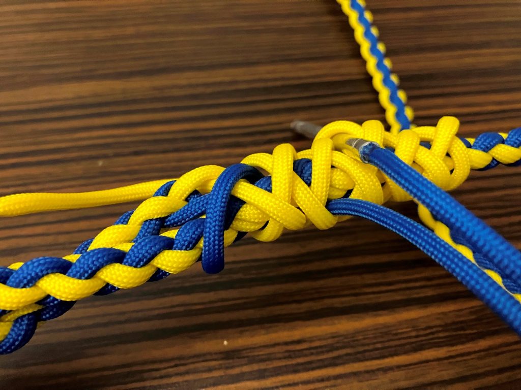 W pierwszej kolejności przeplatamy wszystkie pozostałe linki wzdłuż splotu, przypalając końcówki.