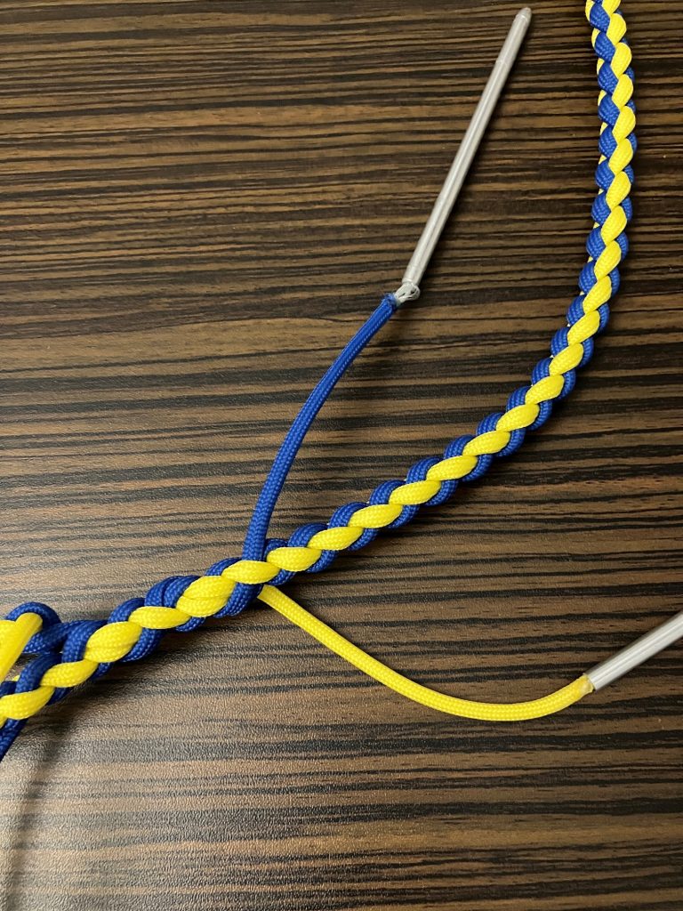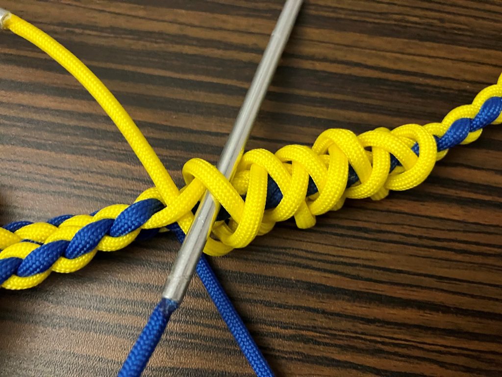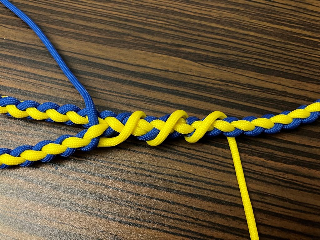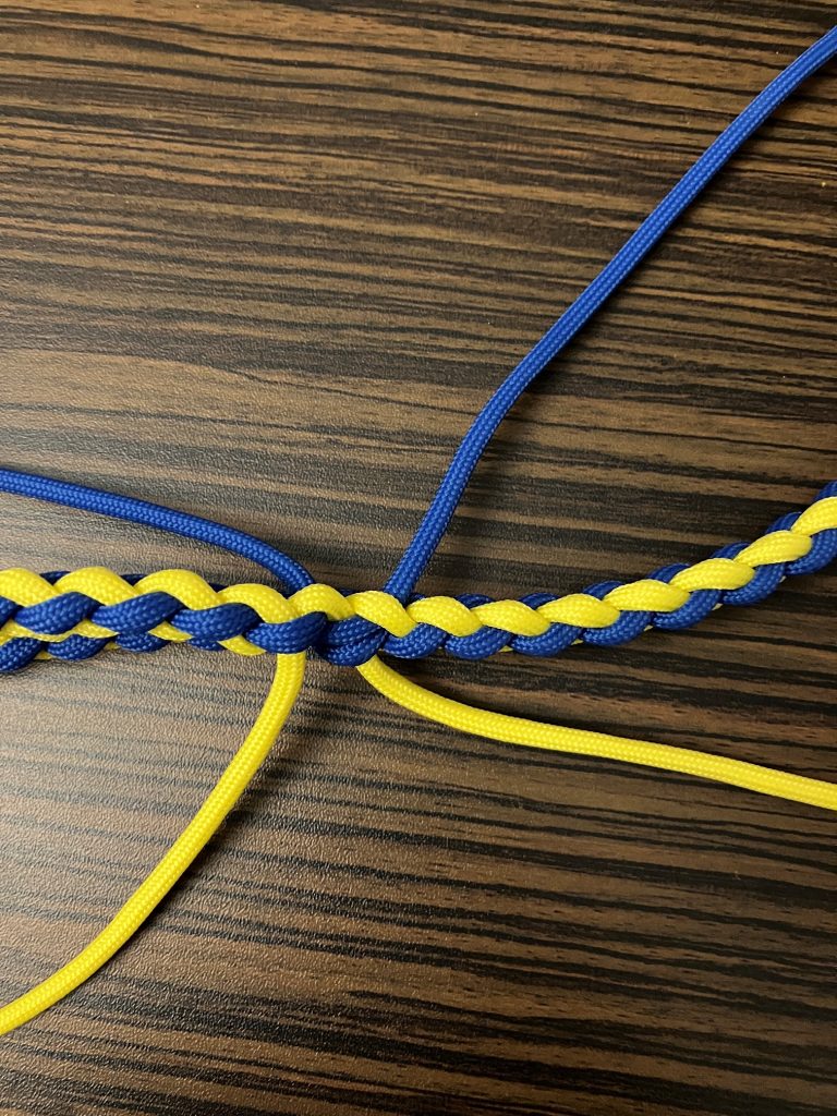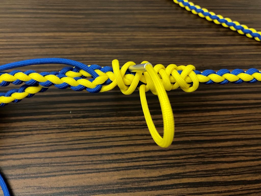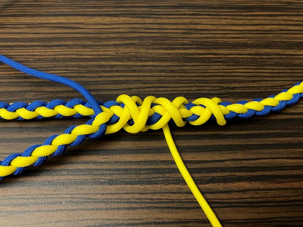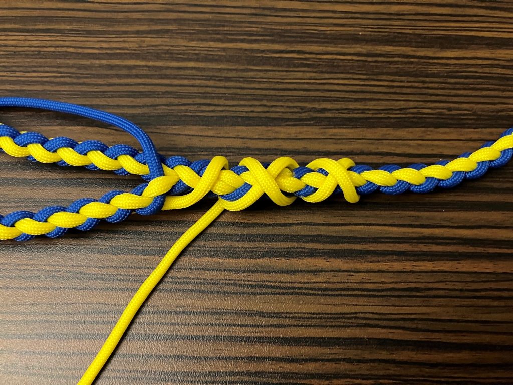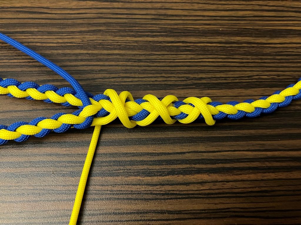 W pierwszej kolejności przeplatamy wszystkie pozostałe linki wzdłuż splotu, przypalając końcówki.