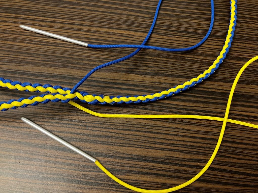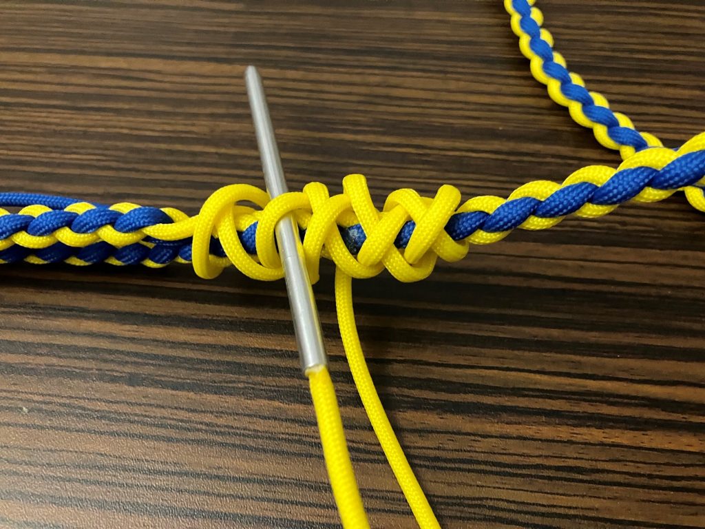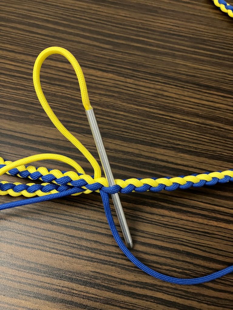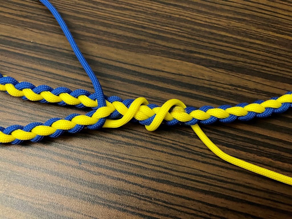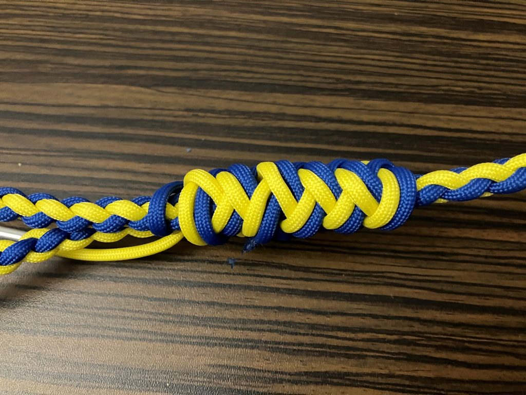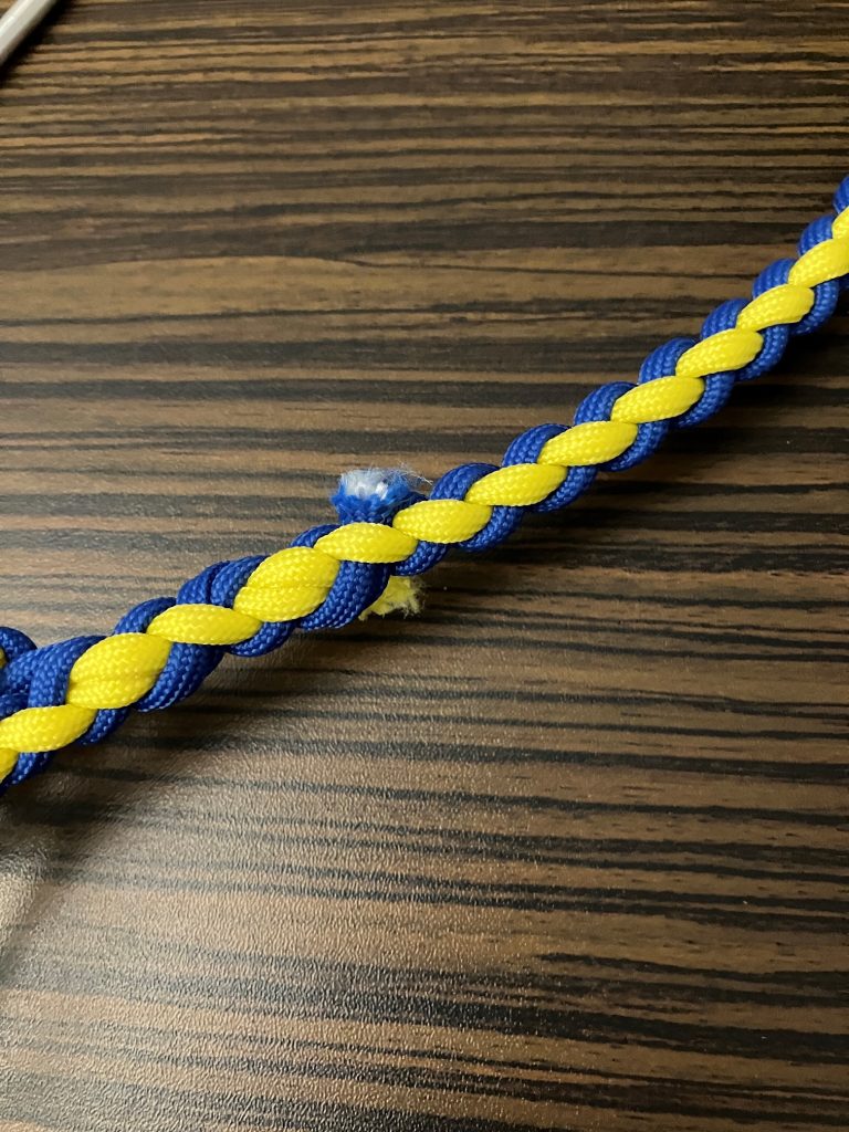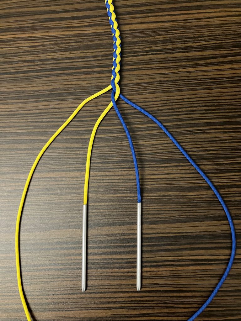 W pierwszej kolejności przeplatamy wszystkie pozostałe linki wzdłuż splotu, przypalając końcówki.