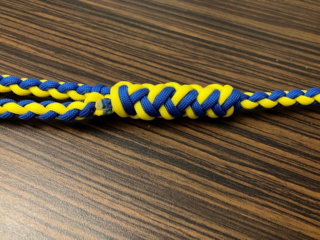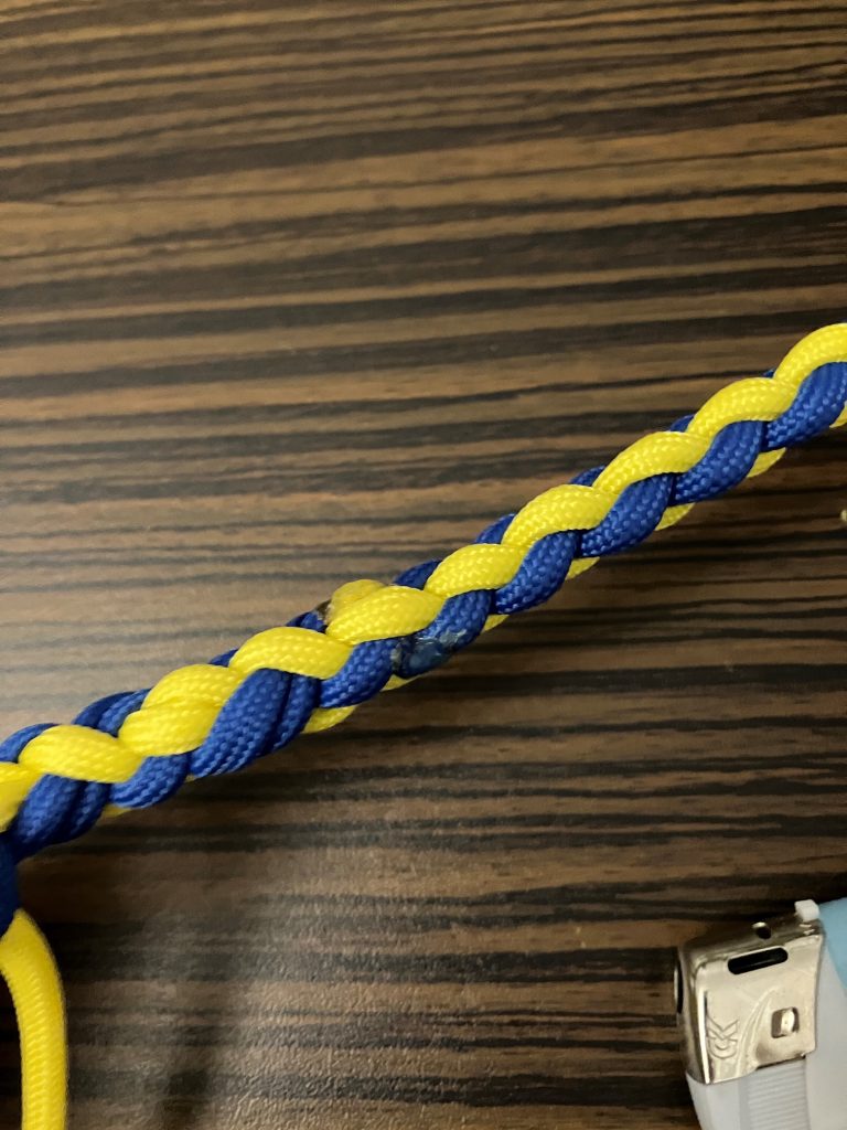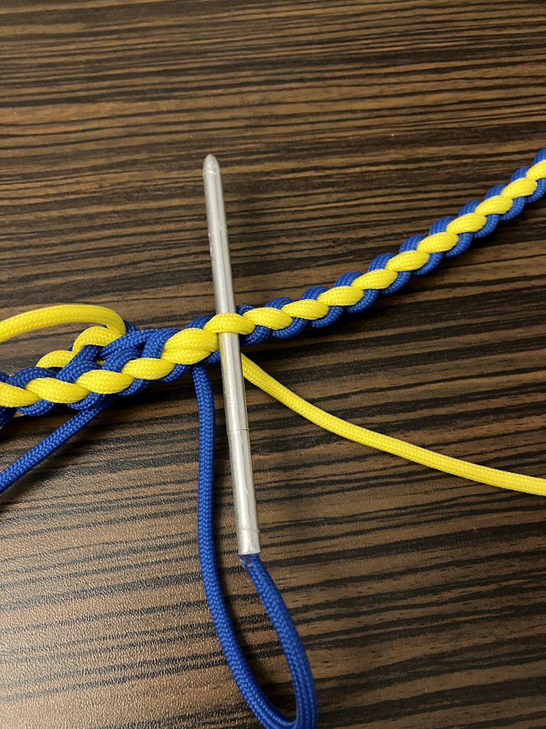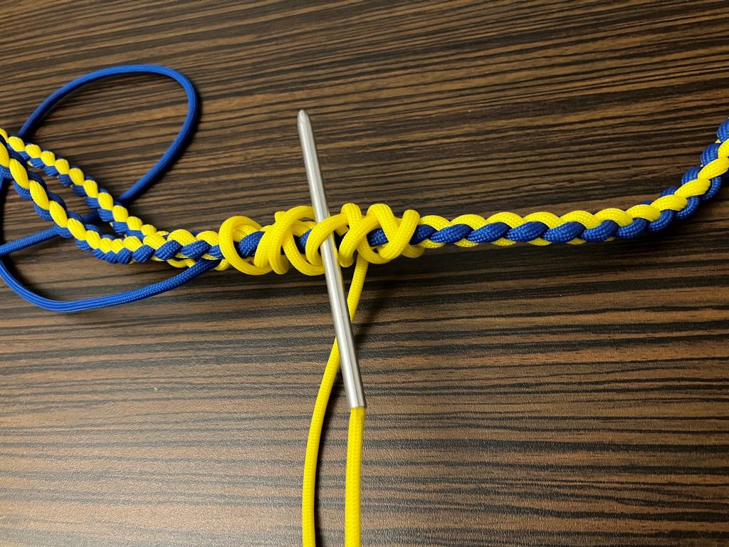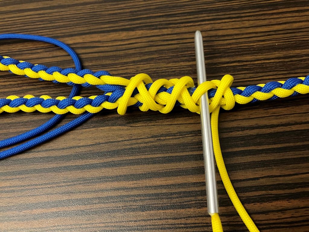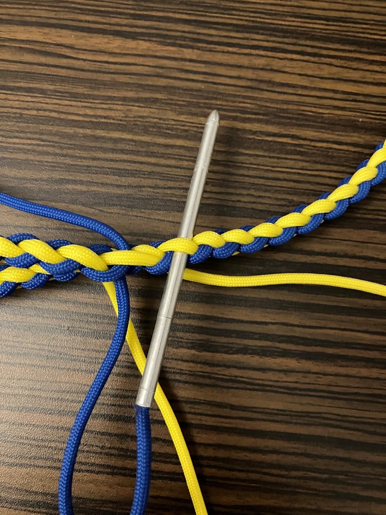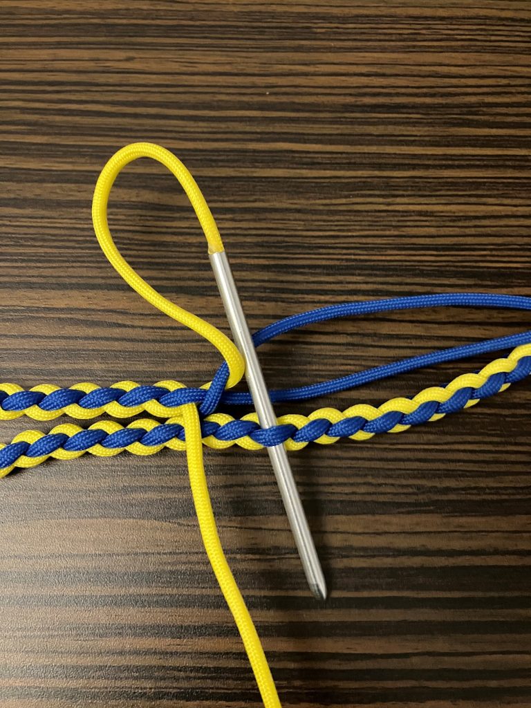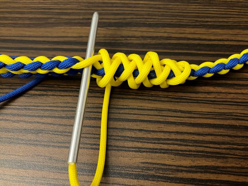 W pierwszej kolejności przeplatamy wszystkie pozostałe linki wzdłuż splotu, przypalając końcówki.